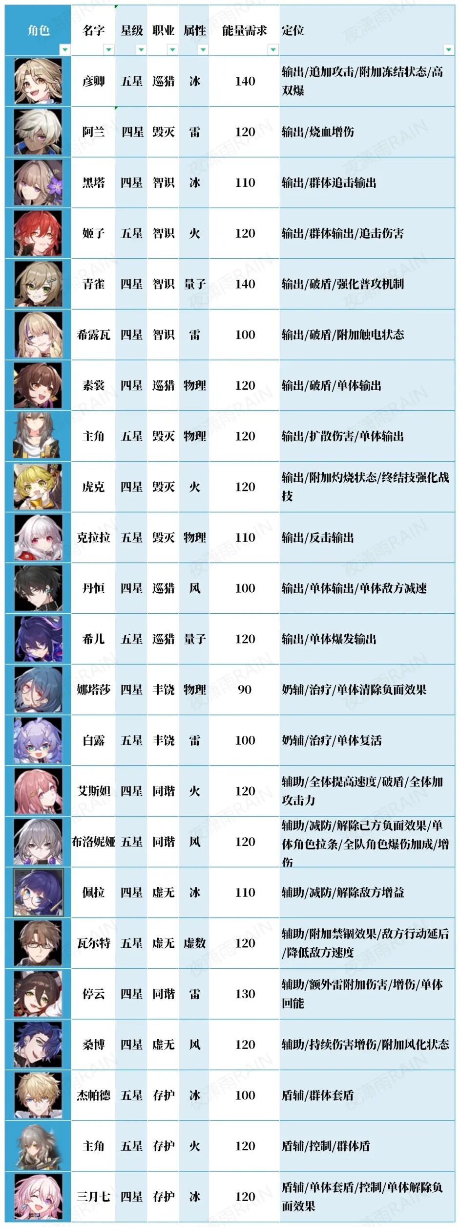 崩坏星穹铁道全角色定位解析1.毁灭(单攻加扩散):物理主角,克拉拉,刃,虎克,阿兰2.丰饶(奶):娜塔莎,罗刹,白露3.巡猎(纯单攻):李素裳,丹恒,彦卿,希儿4.同谐(增幅):大鸭鸭,艾丝妲,停云5.虚无(上debuff):桑博,佩拉,银狼,瓦尔特...