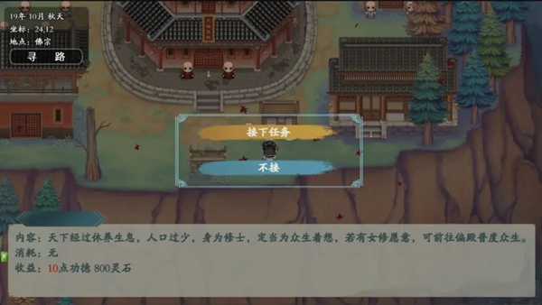 佛宗开放普渡众生任务。先去领取,然后偏殿会开门,等走到最里面与圆圈交互即可触发。