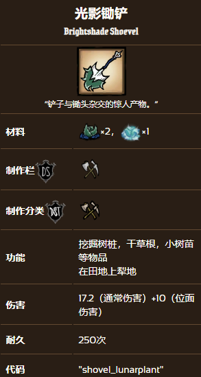 光影锄铲是一件手部装备,既能挖掘植物又能在田地上犁地。耐久为 250 点,挖掘、犁地或攻击时均消耗 1 点耐久。攻击造成 17.2 点通常伤害和 10 点位面伤害,对于暗影生物造成的伤害额外提升 10%,这个效果同时作用于通常伤害和位面伤害。